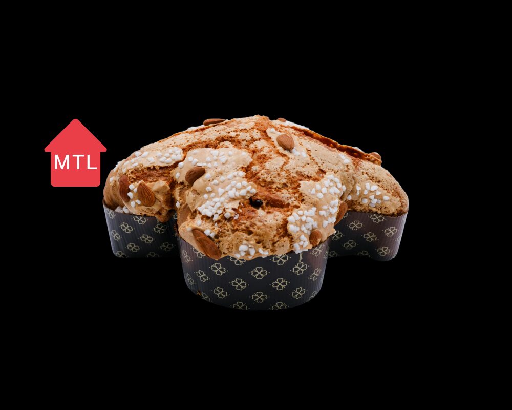 Farine (blé), Beurre 82-84% (lait), Jaunes d'oeufs liquides, Raisins sultana, Oranges confites maison, Sucres (sucre fin, miel du Québec, glucose), Levain naturel, Eau, Lait, Sel, Crème 35%, Fécule de maïs, Gousses de vanille planifolia du Mexique et tahitensis de Papouasie-Nouvelle-Guinée. Ingrédients macaronade: Sucres (sucre glace, sucre grain), Farine (blé), Blancs d'oeufs liquides, poudre d'amandes, Sel, Amandes entières. Peut contenir: Graines de moutarde, Soya, Noix (noisettes, pistaches, pacanes).