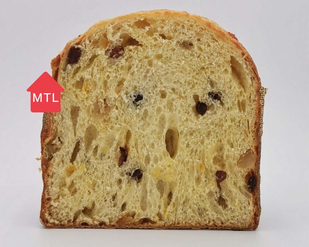 Farine (blé), Beurre (lait), Jaunes d’œufs liquides, Oranges confites maison, Sucres (sucre de canne biologique, sucre fin, miel du Québec, glucose), Raisins sultana, Levain naturel, Eau, Citrons confits maison, Lait, Sel, Crème, Fécule de maïs, Gousses de vanille planifolia biologiques de Guadeloupe, Gousses de vanille de Tahiti, d’Ouganda et de Madagascar. Peut contenir : Graines de moutarde, Soya, Noix (noisettes, pistaches, amandes, pacanes).