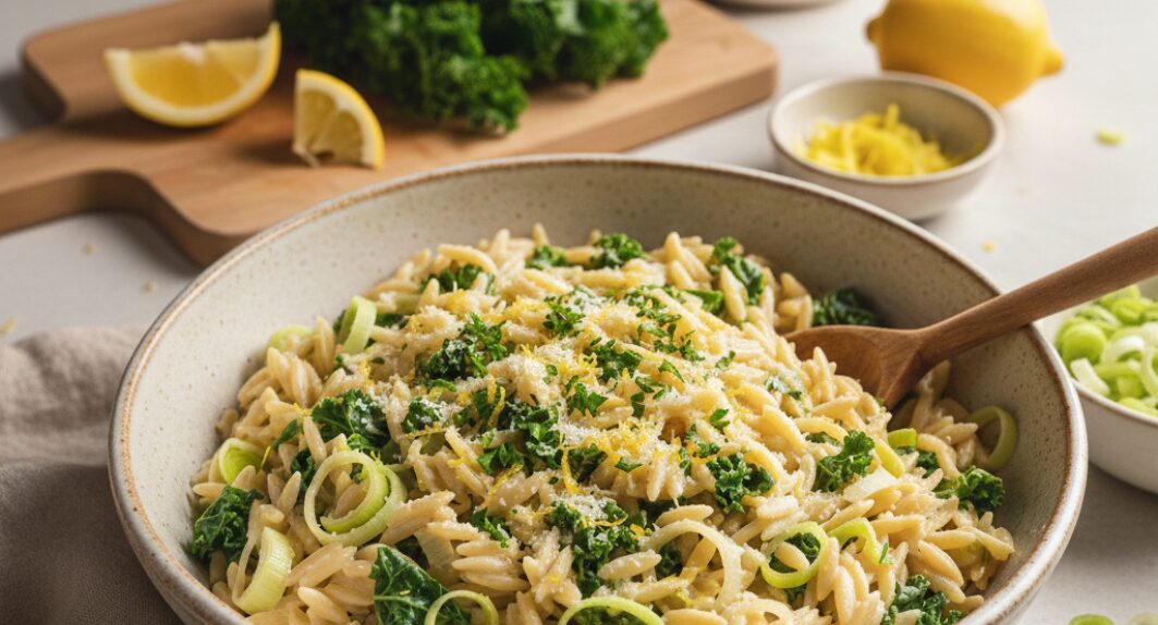 Découvrez une recette de pâtes « one-pot » ultra simple et gourmande pour vos soupers de semaine. Cet orzo crémeux marie la douceur des poireaux fondants à la fraîcheur du zeste de citron, le tout agrémenté de kale pour une touche de vert vitaminé en plein cœur de l’hiver. L’orzo, cette petite pâte en forme de grain de riz, absorbe le bouillon pour créer une texture onctueuse sans avoir besoin de crème épaisse. Une recette végétarienne équilibrée, rapide et savoureuse qui plaira à toute la famille.